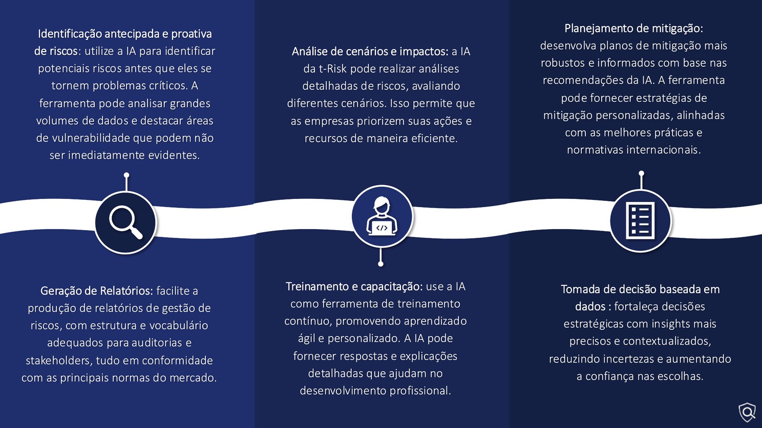 Trata-se de uma IA desenvolvida ao longo de mais de três anos, com curadoria e treinamento executados pelo próprio time da t-Risk, operando em ambiente dedicado e seguro, sem dependência de plataformas externas para tratar informações sensíveis de clientes. Trata-se também de uma inteligência já amadurecida em temas essenciais para a gestão de riscos, a segurança e a resiliência, e que já começou a gerar valor concreto dentro das ferramentas da plataforma.