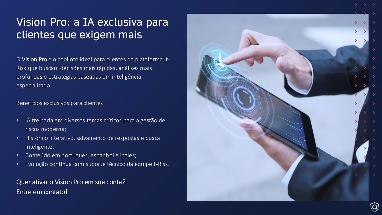 Desde 2025, a inteligência artificial da t-Risk já está integrada às nossas próprias ferramentas, apoiando análises, leituras executivas e produção de relatórios com maior valor agregado para clientes, gestores e stakeholders. O material institucional reforça esse posicionamento ao destacar o Vision Pro como um copiloto para clientes que buscam decisões mais rápidas, análises mais profundas e estratégias baseadas em inteligência especializada.